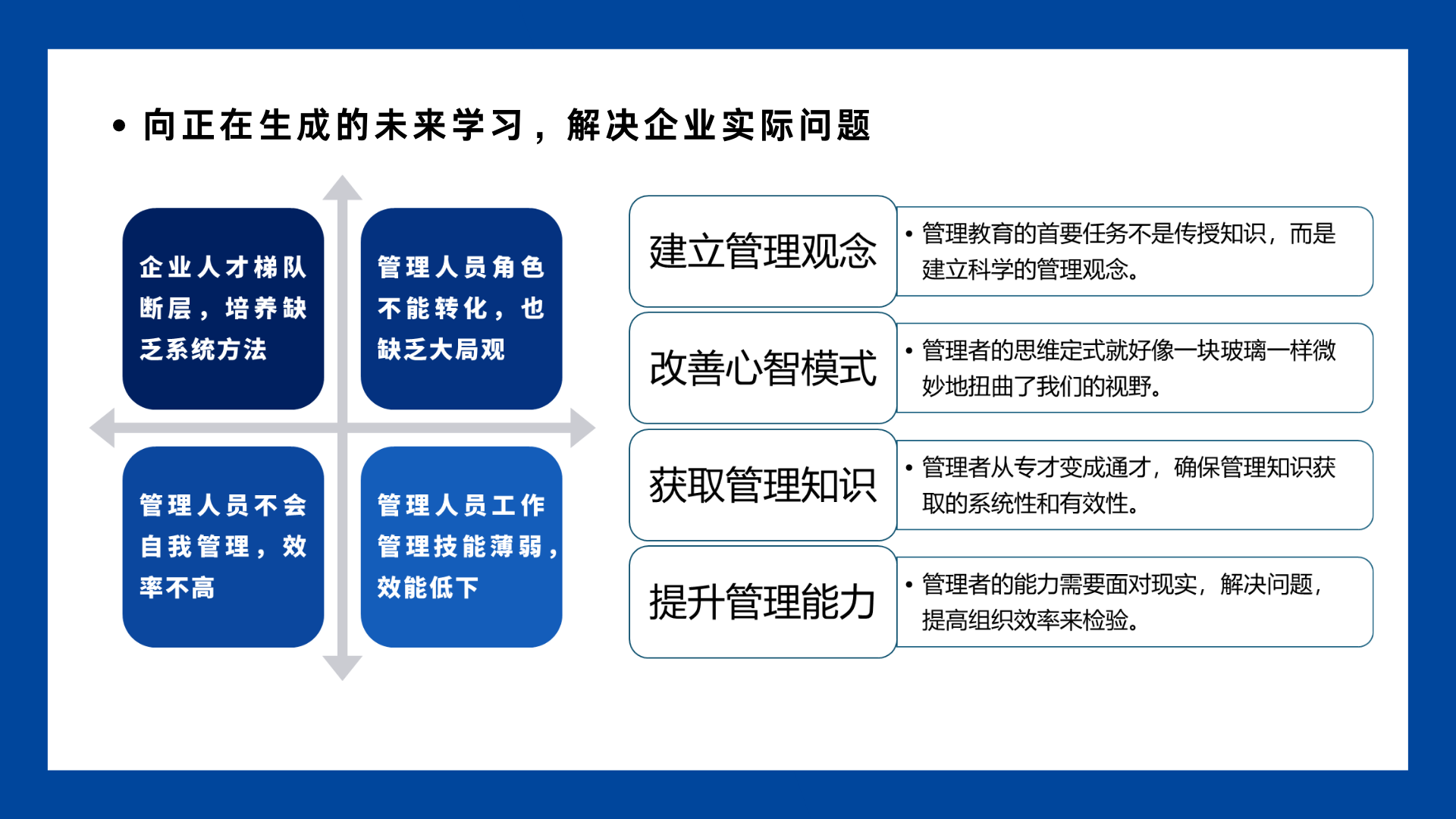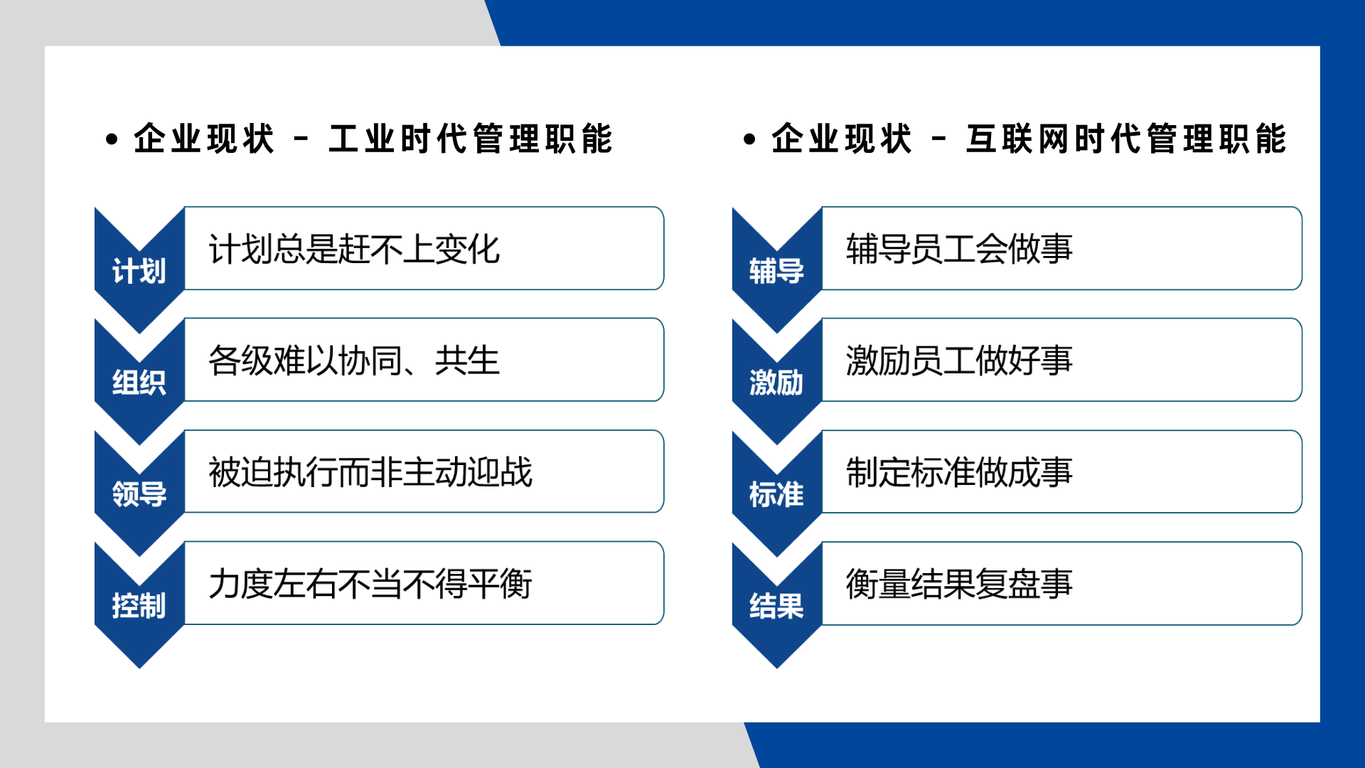 在一個(gè)信息、知識(shí)爆炸的年代,大家想獲得知識(shí)很便捷,甚至很多企業(yè)的管理者學(xué)了大量的課程,對(duì)通用類課程已經(jīng)提不起興趣,更別提去實(shí)踐和運(yùn)用,再有也正是很多管理人員學(xué)了很多課程,大家認(rèn)知的不同,導(dǎo)致青睞的工具、流程不同,這很可怕,就相當(dāng)于發(fā)動(dòng)機(jī)與變速箱不協(xié)調(diào),車子怎么跑得起來(lái)。