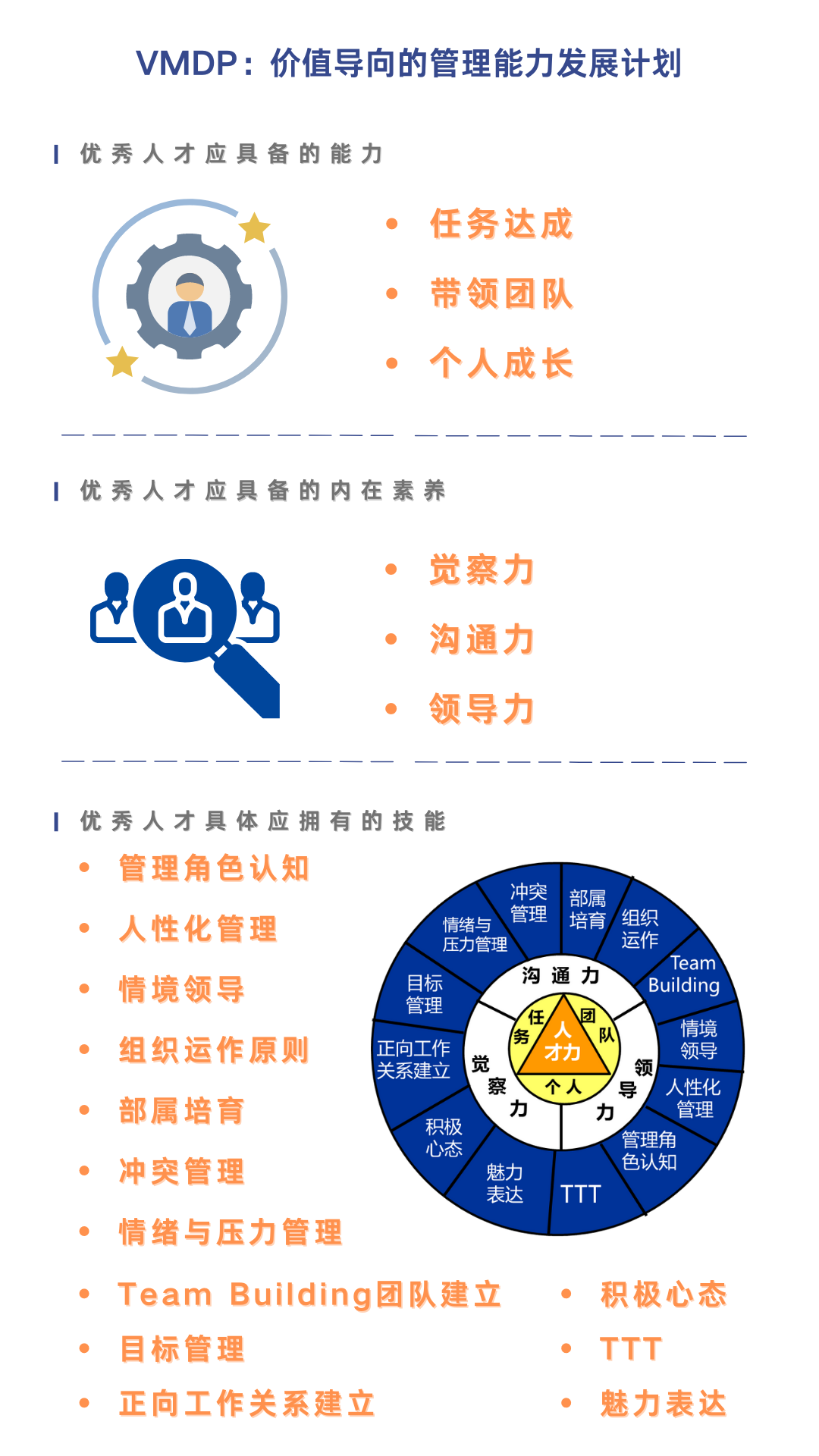 主管需要一套有系統,有效率的方法,幫助達成績效,好主管就像站在艦橋上指揮調度的艦長,必須確保所有船員手眼協調,才能發揮最大力量,VMDP「價值導向的管理能力發展計劃」教導主管如何「規劃」、「組織」、「指導」、「跟進」員工,迅速學會主管所應具備的能力與知識。